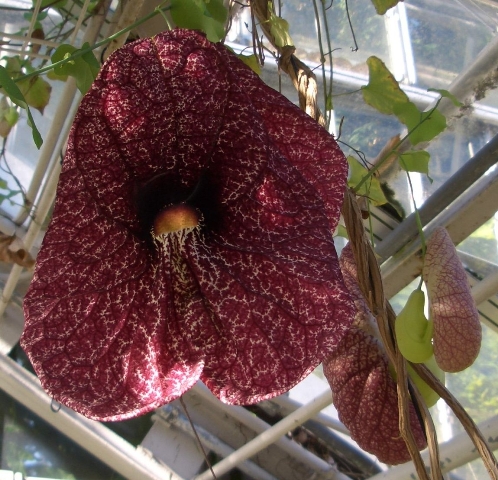 同じ仲間で、花が大きな、アリストロキア・ギガンティアも咲いていますのでこちらも比べてご覧下さい。