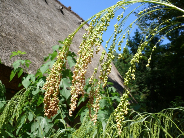 東山植物園では里の暮らしと植物との関わりをご紹介するために、「合掌造りの家」の畑で、モチキビやモチアワなどの作物を育てています。