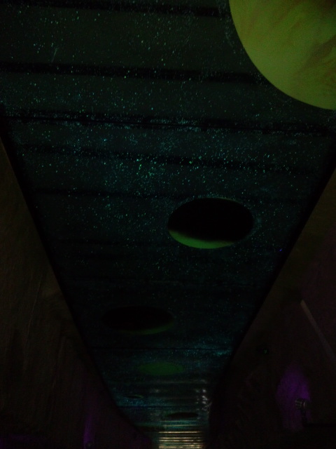このガラス玉に入っている蓄光材は、星が丘門トンネルの「星の光が煌(きら)めく空間」に使われています。蓄光材は光を吸収蓄積することによって光が断たれた後も自ら発光するもので、天井と床に星空をイメージして散りばめてあります。トンネル内には30メートル以上の長さの星空の空間が広がっています。天井には太陽に照らされた惑星も浮かび上がることになり、星が丘門トンネル内には幻想的な雰囲気の宇宙空間が広がっています。