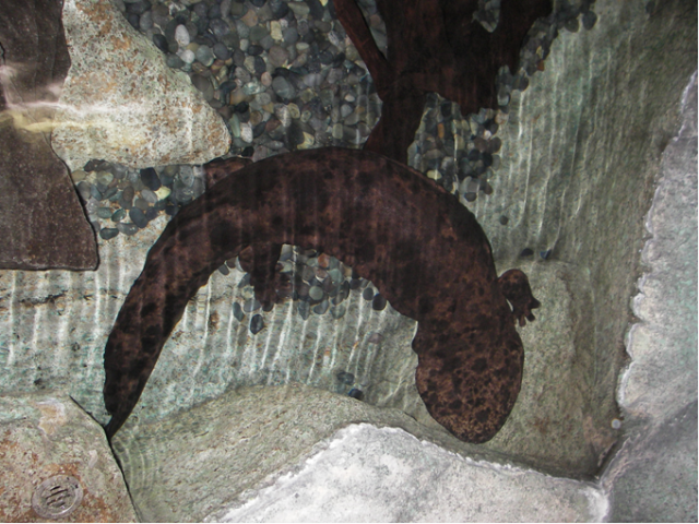 自然動物館には屋外と館内2階の両生類コーナーにオオサンショウウオがいますが、現在2階のオオサンショウウオ展示水槽内を少し工事しています。これはオオサンショウウオの繁殖用の巣(おうち)を作る工事です。