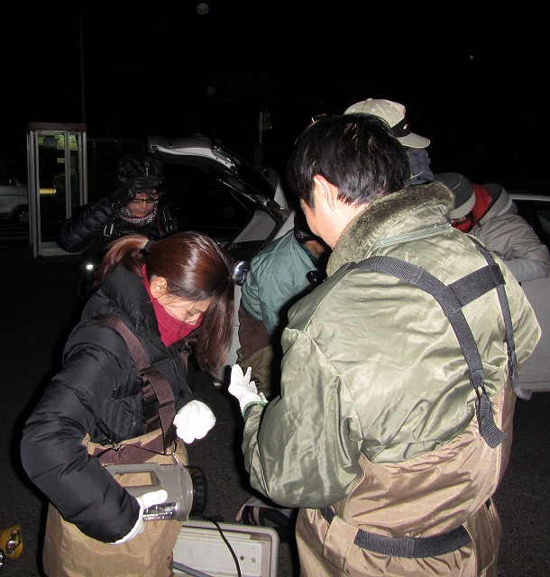 胴長を履き、たも網や照明、計測器具などを手にして準備完了です。