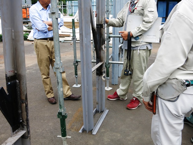 予定している鉄骨補修を確実に施工するため、現場と同じ状況を地上に再現し、適切な溶接のやり方や作業の進め方を色々とためしています。