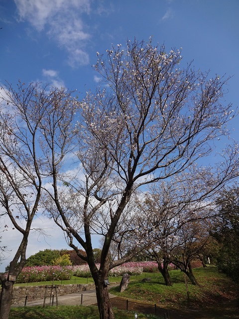 園内では、コブクザクラが猛暑や初秋の雨など今年の天候の加減でしょうか、たくさん花をつけて秋の澄み渡った空に映えています。