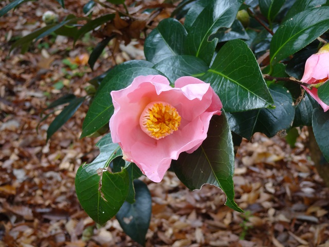 カンツバキの赤い花に混じって、この地方にある園芸種の中京椿にあたるものも咲き始めています。