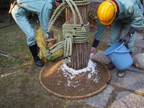 【寒水石で根締めをします。寒水石は雪をイメージ】
