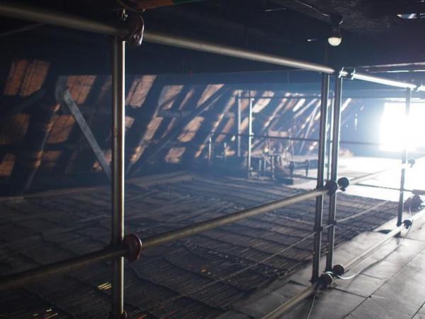 囲炉裏(いろり)炊(だ)きの日に合掌造りの家に入ると、ほんの数分でけむりの匂いが服に付きます。でも囲炉裏炊きは、合掌造りの家とは深い関わりがあります。それは囲炉裏炊きによる熱とけむりが、かやぶき屋根の乾燥と防虫の役目をはたし、屋根を長持ちさせています。もちろん薪(まき)を燃やしたけむりでいぶさないと効果がないため、ガスや電気では代用できません。
