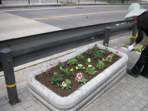 「どう配置する?」「寄せ植えがいいよね」「プランターごとに特徴を持たせたいなぁ」などと話合いをしながらの配置です。レイアウトを考えるとき、大勢でやると意見も色々。まとまるのに時間がかかるので、私たちは少人数で考えることにしています。今回は花の種類も色も豊富だったので配置だけで30分以上かかりましたが、レイアウトを待つ間もやることはたくさんあります。連休中に伸びた雑草を抜き、花壇をすっきりさせることができました。