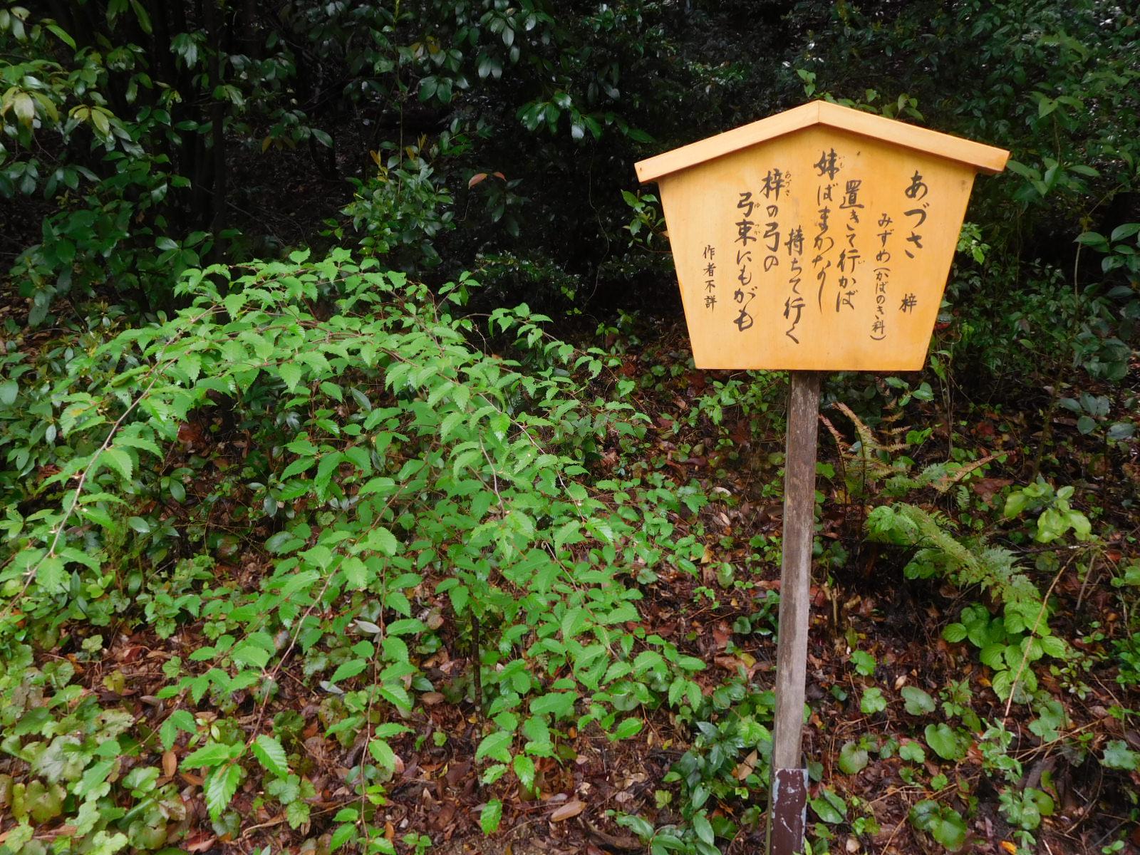 万葉の散歩道の梓の歌の横には、カバノキ科の「ミズメ」が展示されています。インターネットで検索してみると、梓には、「ミズメ」の他にノウゼンカズラ科の「キササゲ」も出てきます。