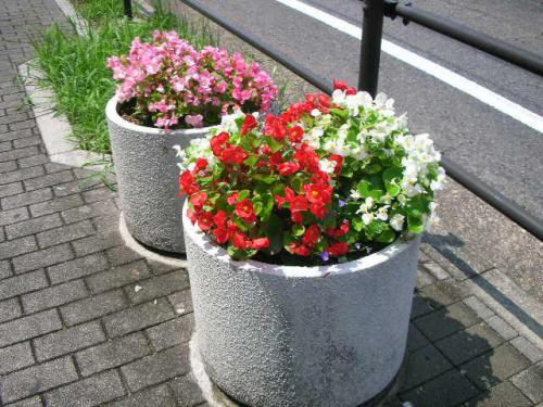 自動車学校の沿道の、ベゴニアとガザニアを植えた鉢。予想以上にベゴニアの背が伸び、よく見ればガザニアの元気がありません。