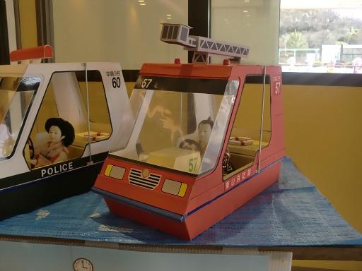 東山ボートハウスの福よせ雛は、「パトカー」「はしご車」「ショベルカー」のペダルボートに1体ずつ乗っていらっしゃいます。