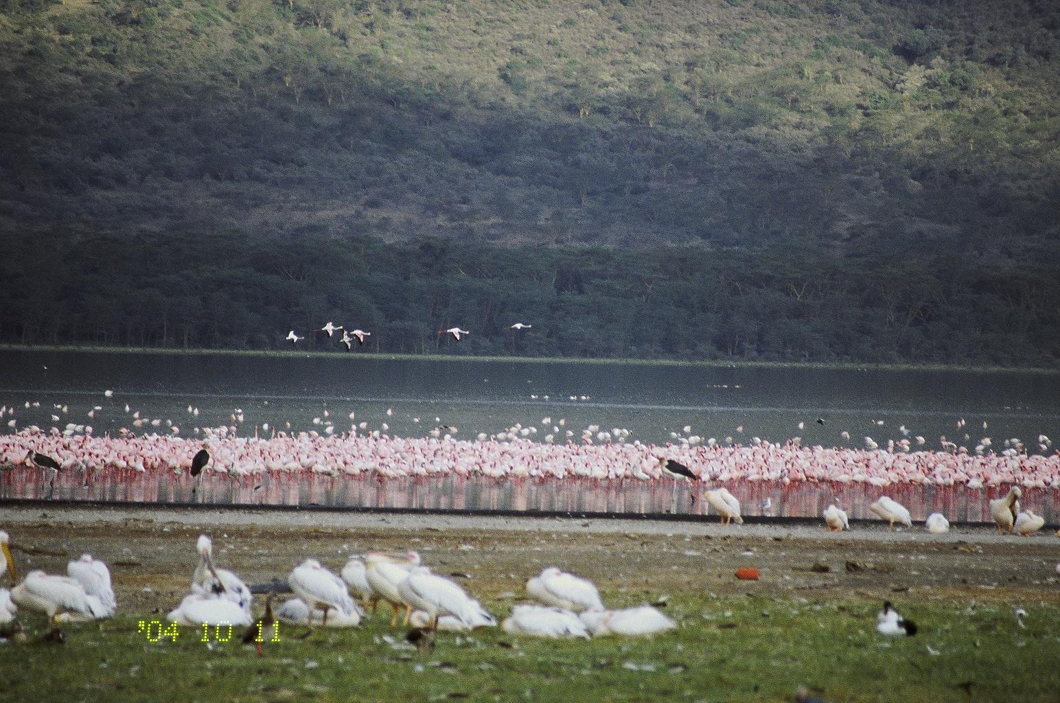 ナクル湖はケニアの大地溝帯の中にある水深の浅いアルカリ湖で、フラミンゴが好んで食べる "スピルリナ" と呼ばれる植物性プランクトンが大量に発生する餌場です。そのため多くのフラミンゴが飛来しており、水辺はまるでピンク色の花びらをちりばめたようでした。