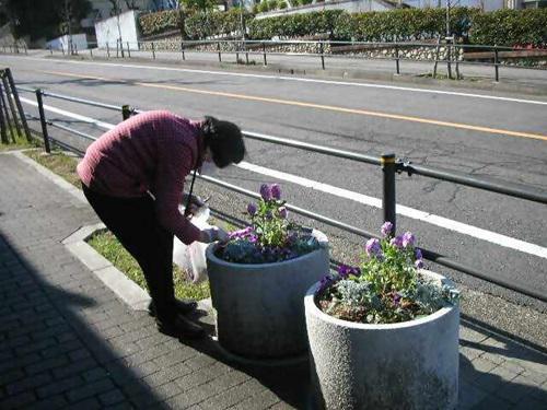 プランターの土は先日の雨のおかげでしっとり湿っていたので「今日は花殻摘みをしましょう」と、それぞれが坂道に設置してあるプランターに向かいました。手にはハサミと小さなごみ袋を持って、一斉に活動スタート!