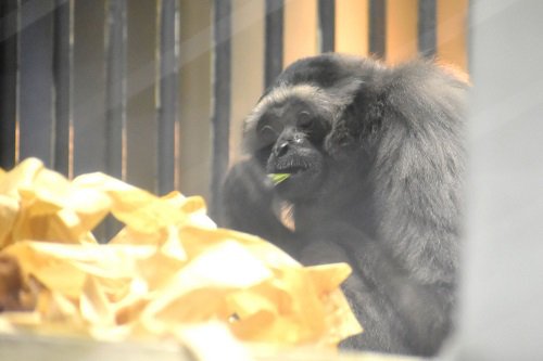 ゴリラ・チンパンジー舎の向かい側にある、旧類人猿舎では、現在4頭のボルネオテナガザルたちが暮らしています。大きい展示室と小さい展示室に1頭ずつ、1日ごとに交代で展示しているため2頭しか同時に展示できません。展示室にいない2頭はバックヤードで元気に過ごしているのでご安心ください。