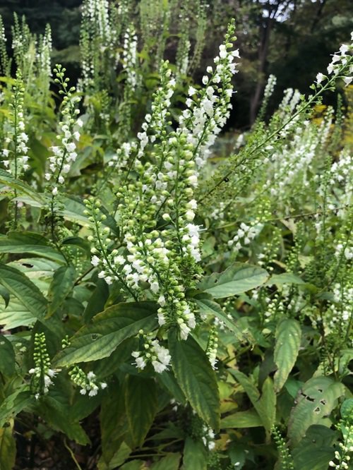 源氏の庭では、パラパラ咲きだったシモバシラの花にボリュームが出てきました。