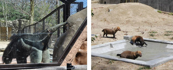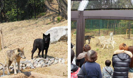 群れで走り回るオオカミの息づかいを間近で感じることができます。 野性と同じように樹木に覆われた広い運動場の中を群れで走り回るオオカミの姿をご覧いただけます。 見学場所は、お堀部分はプール越しに柵なしで、ガラス部分は顔と顔がつくほど近くでオオカミをご覧いただけます。さらに二重網部分ではオオカミの臭いや体温まで直接感じていただくことができます。