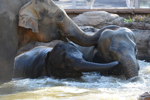 東山の森を背景に、アジアゾウのふるさと 「スリランカ」を体感しよう!ゾウのための工夫がいっぱい。また、ゾウのことが学べる魅力もいっぱい。野生の環境により近づけた新しいお家をご覧ください。